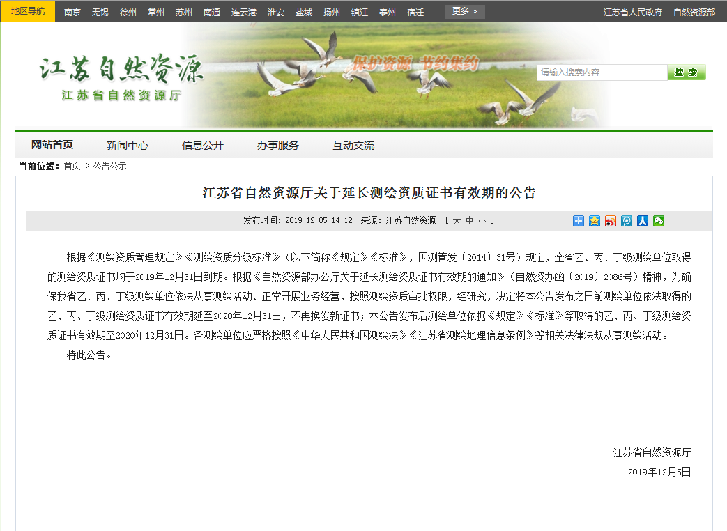 江蘇省自然資源廳關(guān)于延長(zhǎng)測(cè)繪資質(zhì)證書(shū)有效期的公告