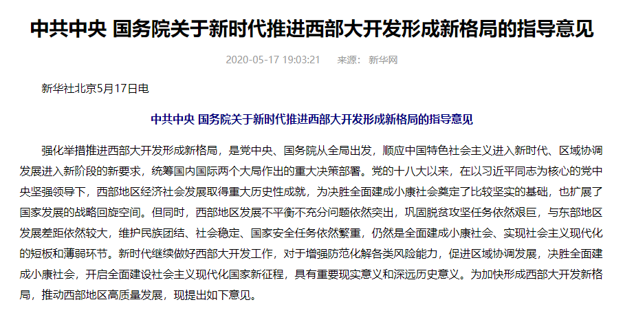 據(jù)新華社消息,《中共中央 國(guó)務(wù)院關(guān)于新時(shí)代推進(jìn)西部大開(kāi)發(fā)形成新格局的指導(dǎo)意見(jiàn)》(下稱(chēng)《意見(jiàn)》)于2020年5月17日發(fā)布。