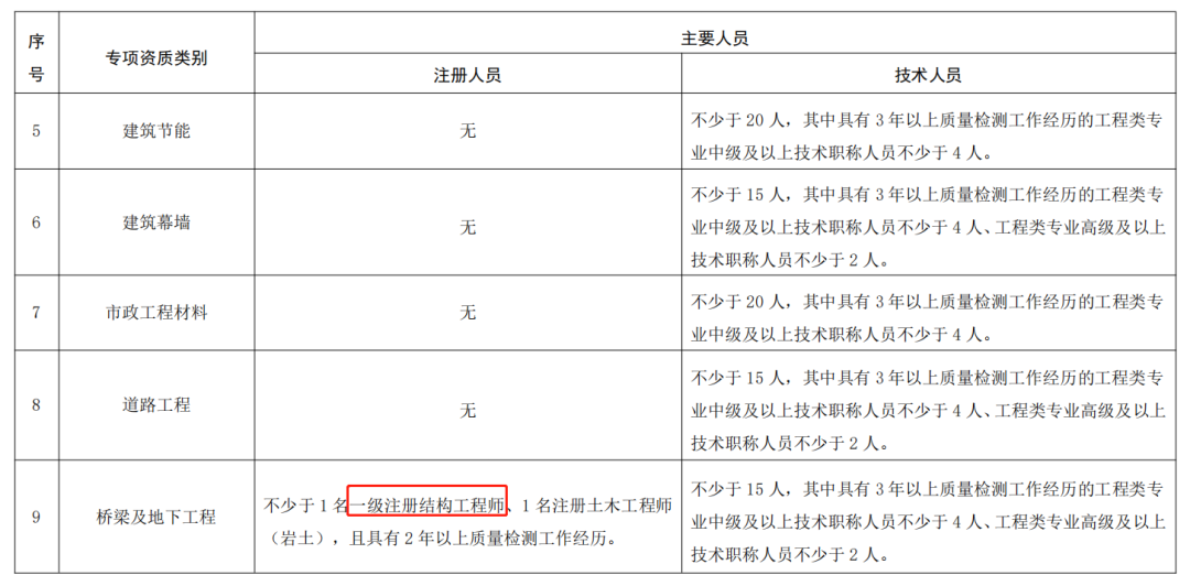 主體結(jié)構(gòu)及裝飾裝修、鋼結(jié)構(gòu)、地基基礎(chǔ)、建筑幕墻、道路工程、橋梁及地下工程等6項(xiàng)專項(xiàng)資質(zhì),應(yīng)當(dāng)具有3年以上質(zhì)量檢測經(jīng)歷 |