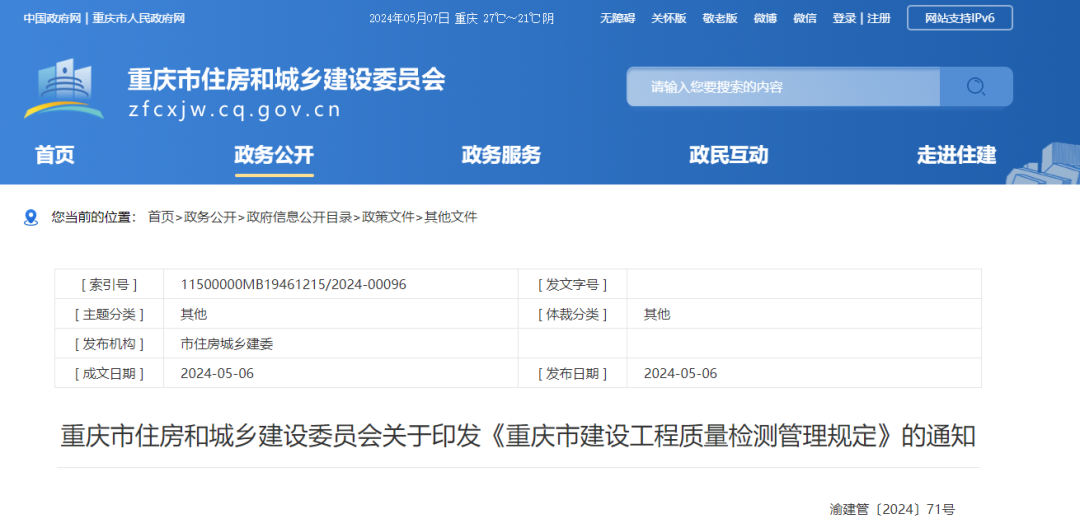 日前,重慶市住建委發(fā)布關(guān)于印發(fā)《重慶市建設(shè)工程質(zhì)量檢測管理規(guī)定》的通知(下滑可查看全文)。本規(guī)定自2024年5月1日起實(shí)施。