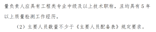 具有工程類專業(yè)中級及以上技術(shù)職稱,具有5年以上質(zhì)量檢測工作經(jīng)歷 |