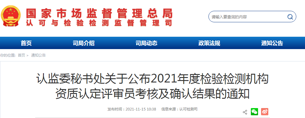 2021年度檢驗(yàn)檢測機(jī)構(gòu)資質(zhì)認(rèn)定評審員考核及確認(rèn)結(jié)果公布